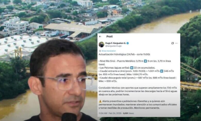 El alcalde de Montería, Hugo Kerguelén, informó a través de su cuenta oficial en X una nueva actualización hidrológica con corte a las 11:00 a.m. de este 24 de febrero, en la que se evidencia un incremento en los niveles y caudales del río Sinú.