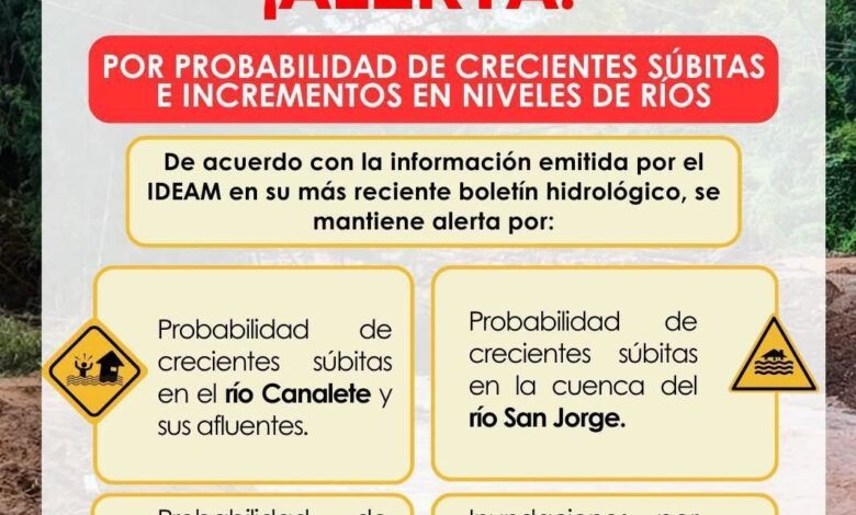 En el caso de Los Córdobas, las autoridades advierten sobre posibles inundaciones tanto en el casco urbano como en sectores rurales.