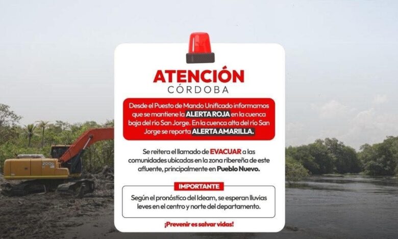 El Puesto de Mando Unificado (PMU) mantiene activa la alerta roja en el municipio de Ayapel y en la cuenca baja del río San Jorge, que afecta principalmente a Pueblo Nuevo, ante el ingreso continuo de agua a través de los boquetes Caregato y Los Arrastres y los niveles críticos del río, según los reportes del Ideam y la Corporación Autónoma Regional de los Valles del Sinú y San Jorge (CVS). En la cuenca alta del río San Jorge se mantiene alerta amarilla.