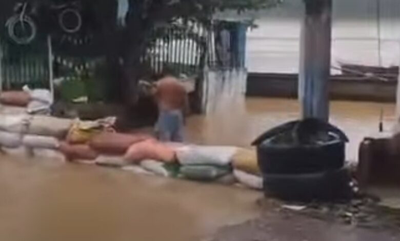 La comunidad del sector 7 de Mayo, en el barrio Mocari, continúa colocando sacos de arena para tratar de contener la emergencia, mientras el caudal del río sigue aumentando.