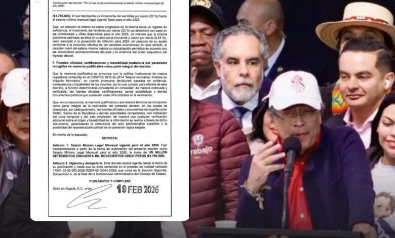 El presidente Gustavo Petro firmó este 19 de febrero el Decreto 0159 de 2026, que establece el Salario Mínimo Legal Mensual en $1.750.905 para el presente año, manteniendo un aumento del 23,7 % respecto al 2025. Desde la Plaza de Bolívar, el mandatario aseguró que no dará “un paso atrás” en torno a este incremento.